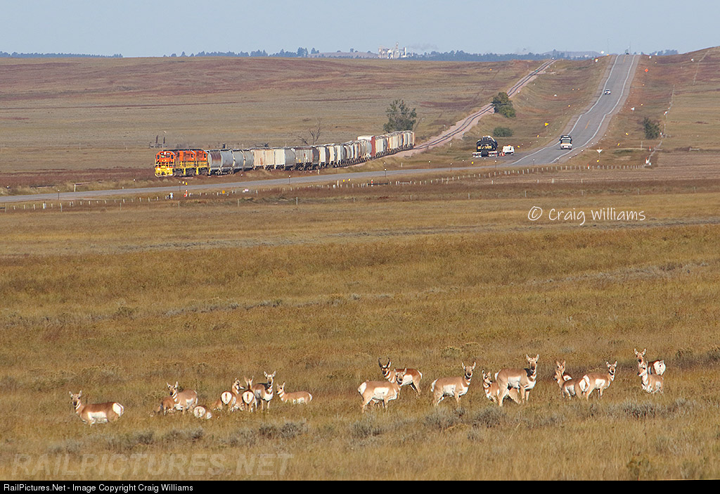 Here the job is southbound as they approach the HBD at MP 161. A herd of pronghorns look on wondering what we are up too as the train slowly pokes along at 10 mph. The bentonite plants that originated the cars can be seen in the background and are 12 miles up the highway 212. Not much to see out here but open country and orange 40's! |