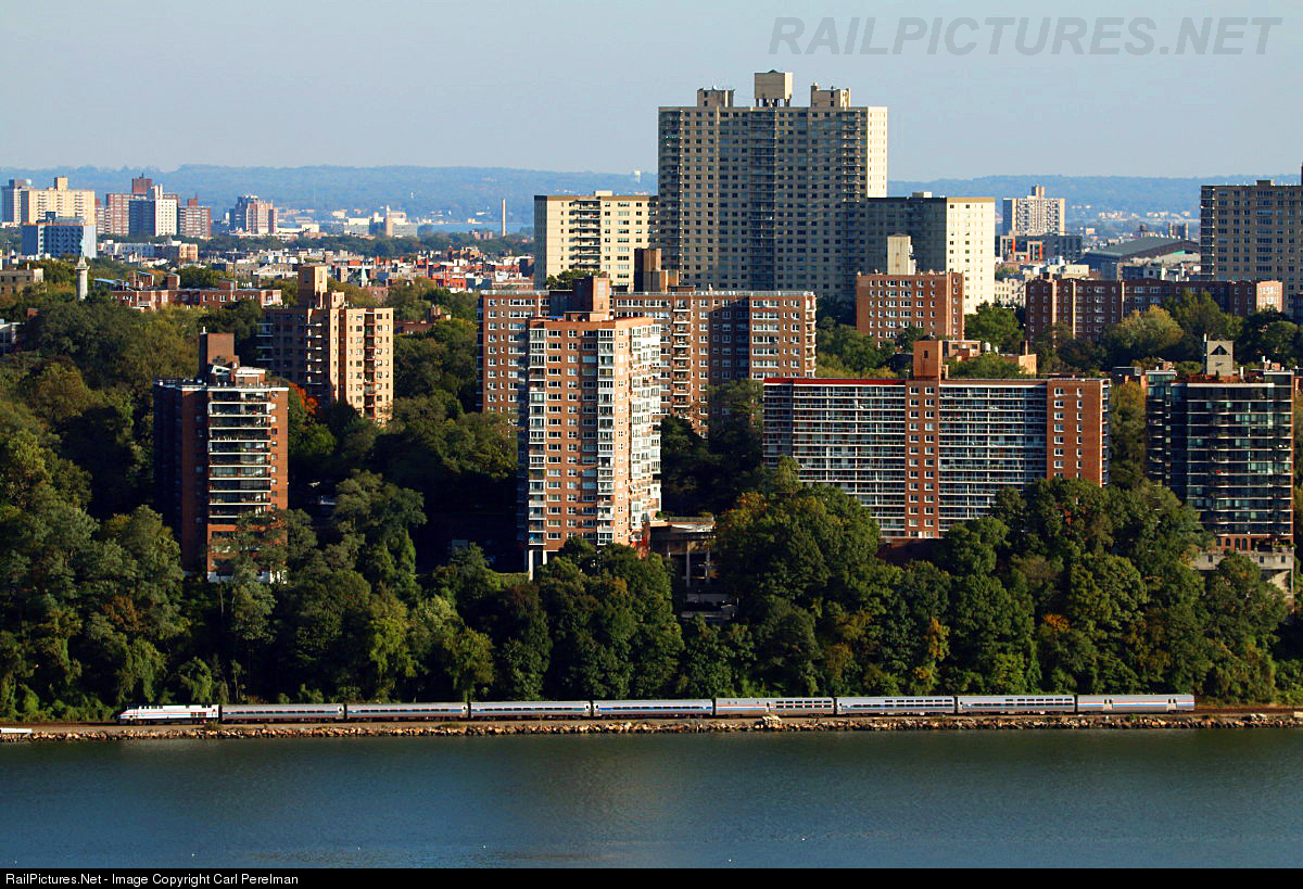 | Amtrak's westbound Lake Shore Limited has just crossed over from the Amtrak West Side Line onto Metro North's Hudson Line as it passes the Riverdale section of the Bronx. Today's train has a Viewliner dining car in the consist. |