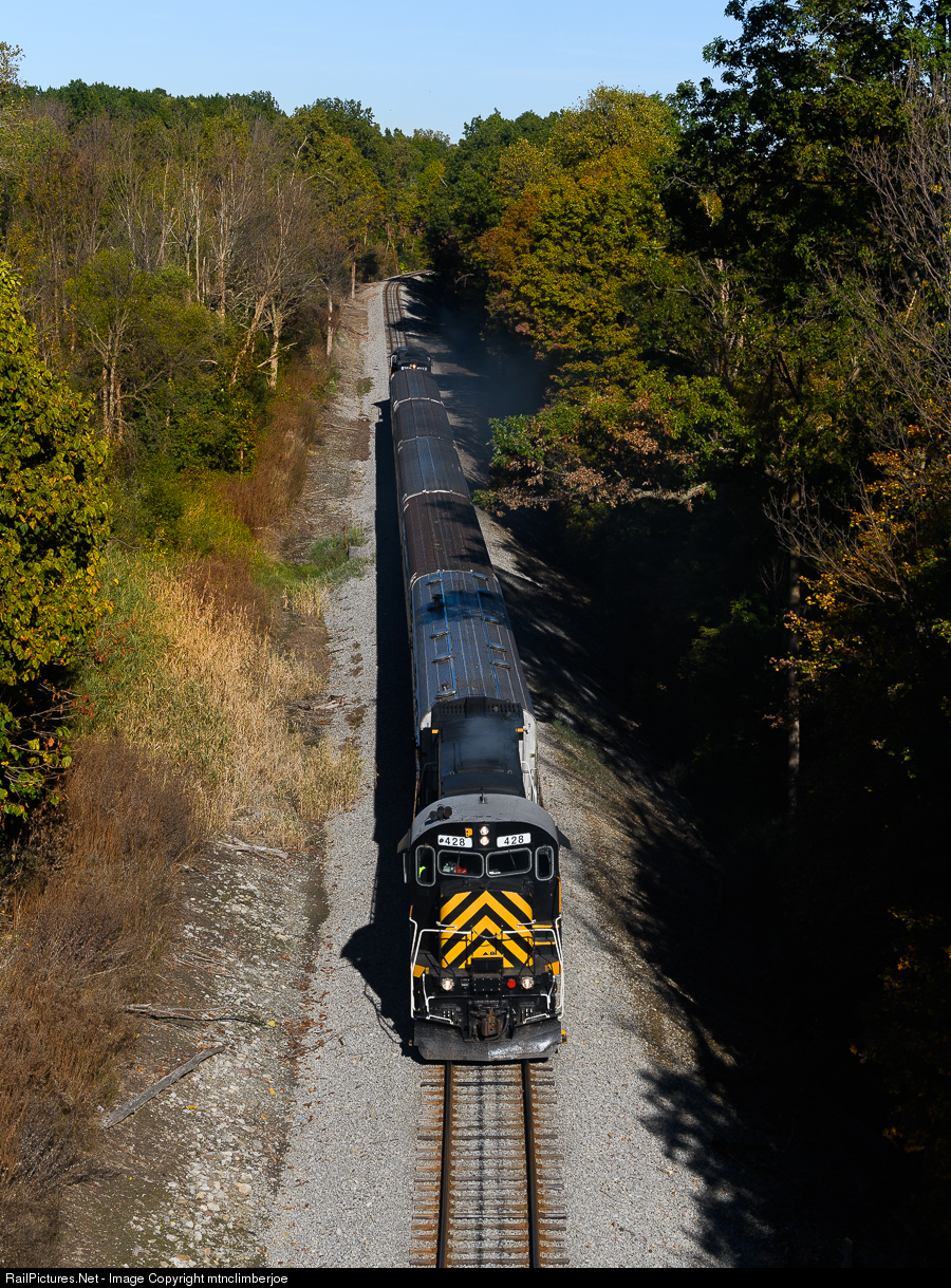The final excursion of the day over the LA&L heads back towards Lakeville with a pair of Alcos pulling former NYC coaches. The train has just passed under I-390 and follows the valley of Conesus Creek before turning south into the railroad's yard in Lakeville.