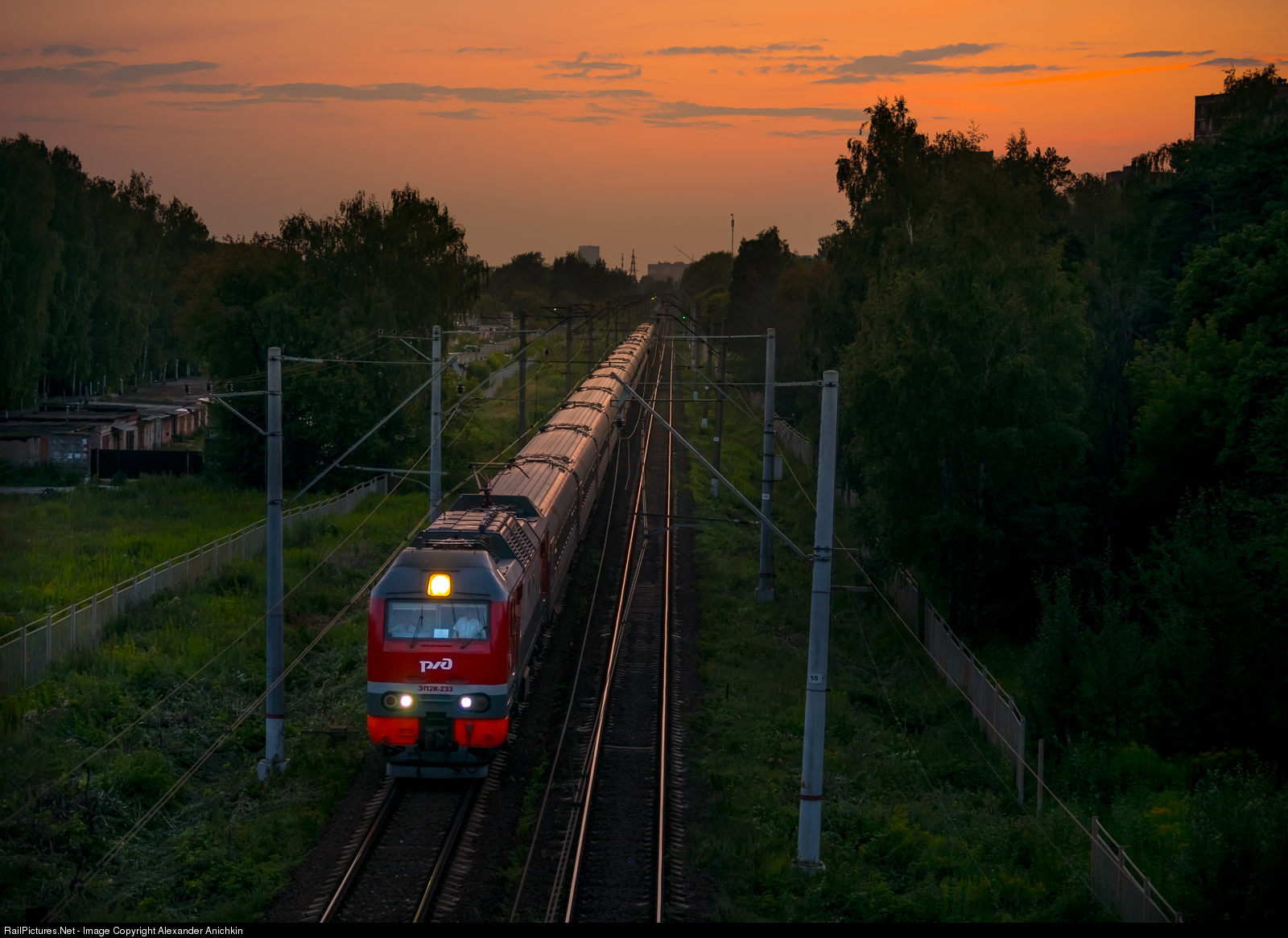 | EP2K-233 DC locomotive with the passenger train branded as "Vyatka" (named after the river in the north of Russia) runs from Moscow to Kirov in the summer twilight |