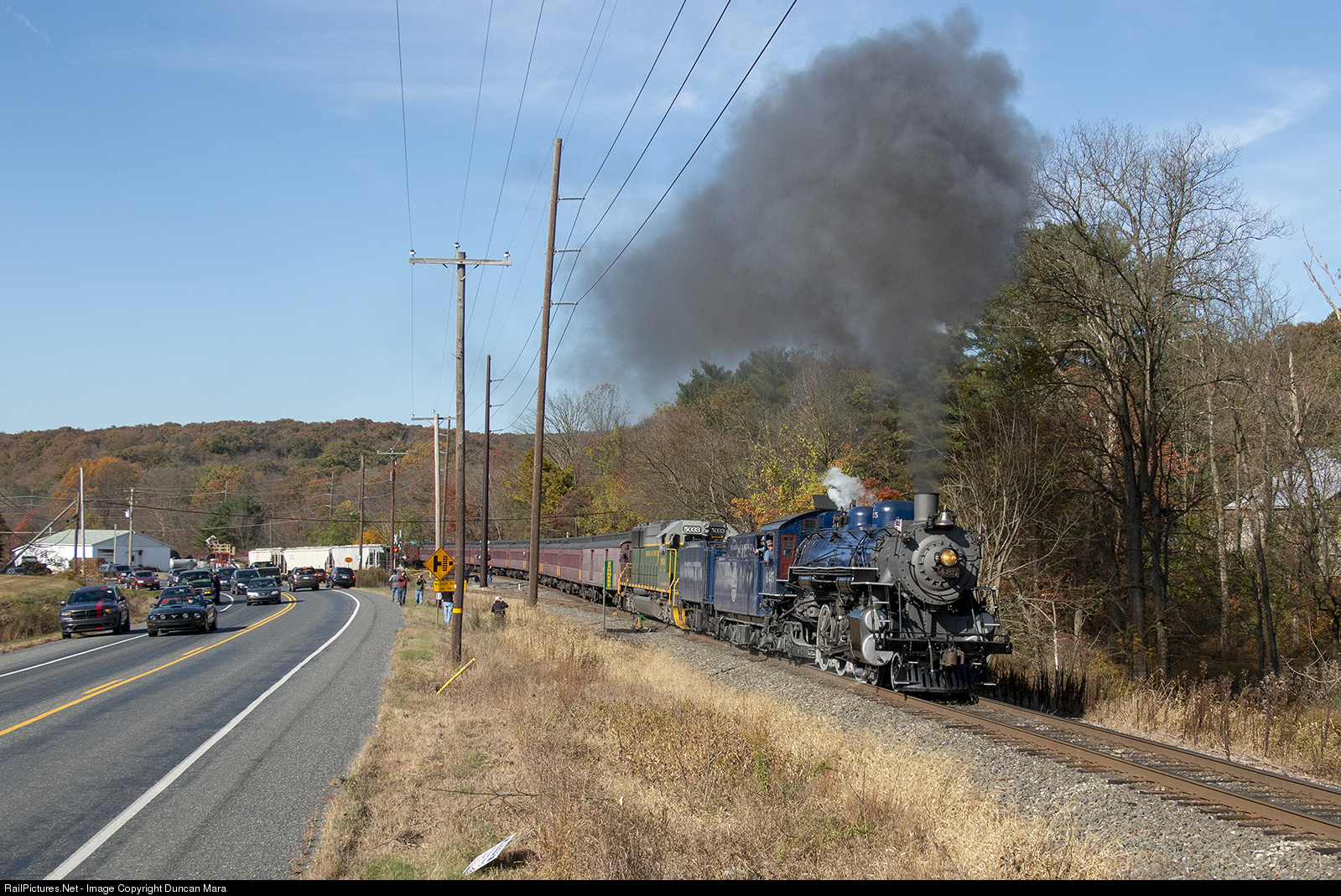 | R&N Pacific 425 powers the Reading and Northern's Autumn Leaf through Zehners, PA as droves of railfans photograph and follow the train along the adjacent main road. |