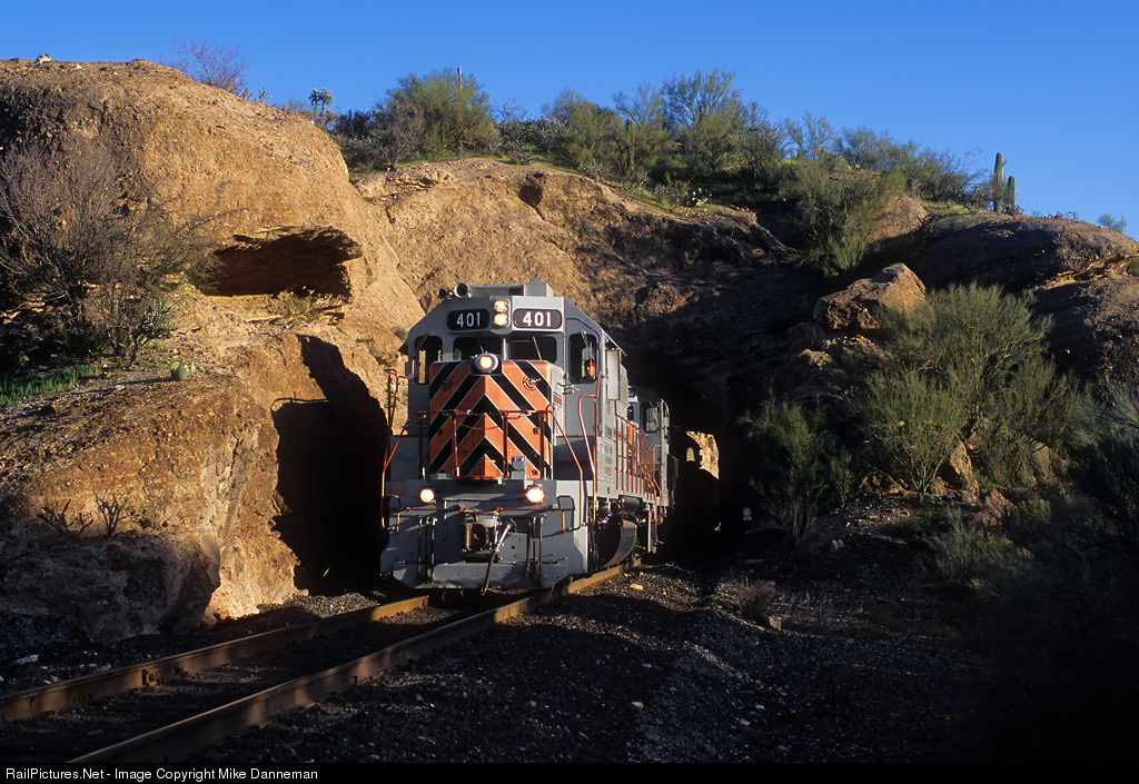| Copper Basin Railway EMD GP39 No. 401 leads empty ore train OT-1 out of Tunnel 2 at Ray Junction, Arizona, late in the afternoon of March 17, 2004. |