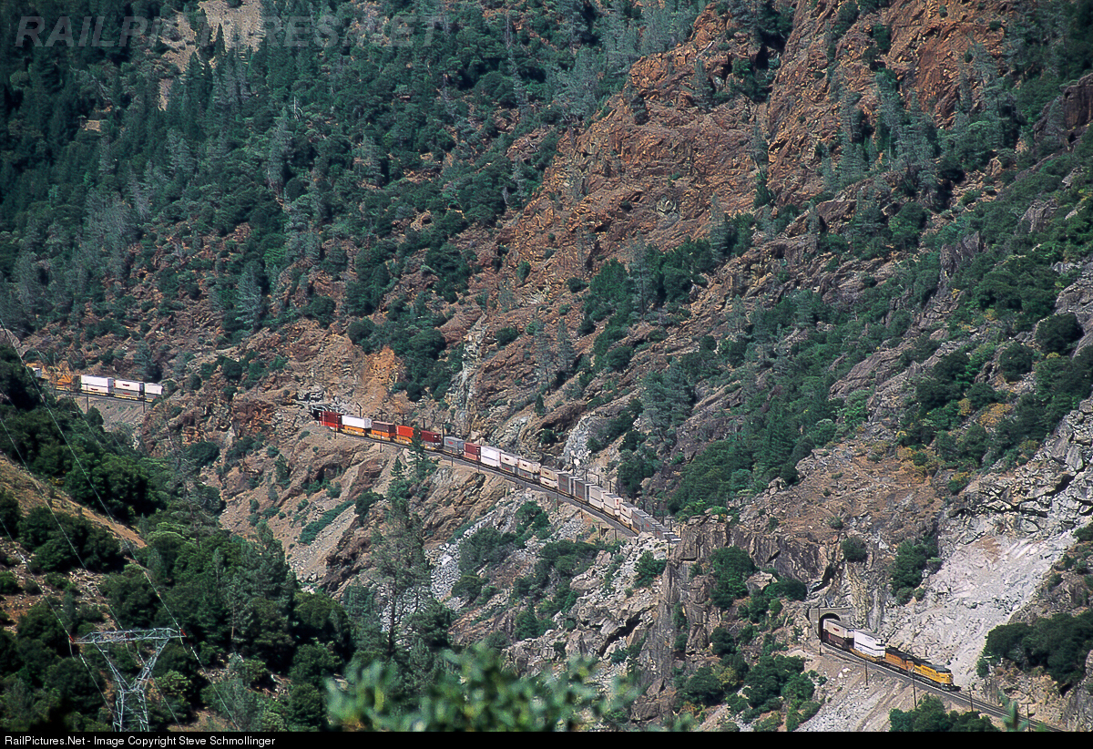 | A westbound UP stack train threads tunnels 10 and 9, in that order, deep in the Feather River Canyon near Poe, CA. |