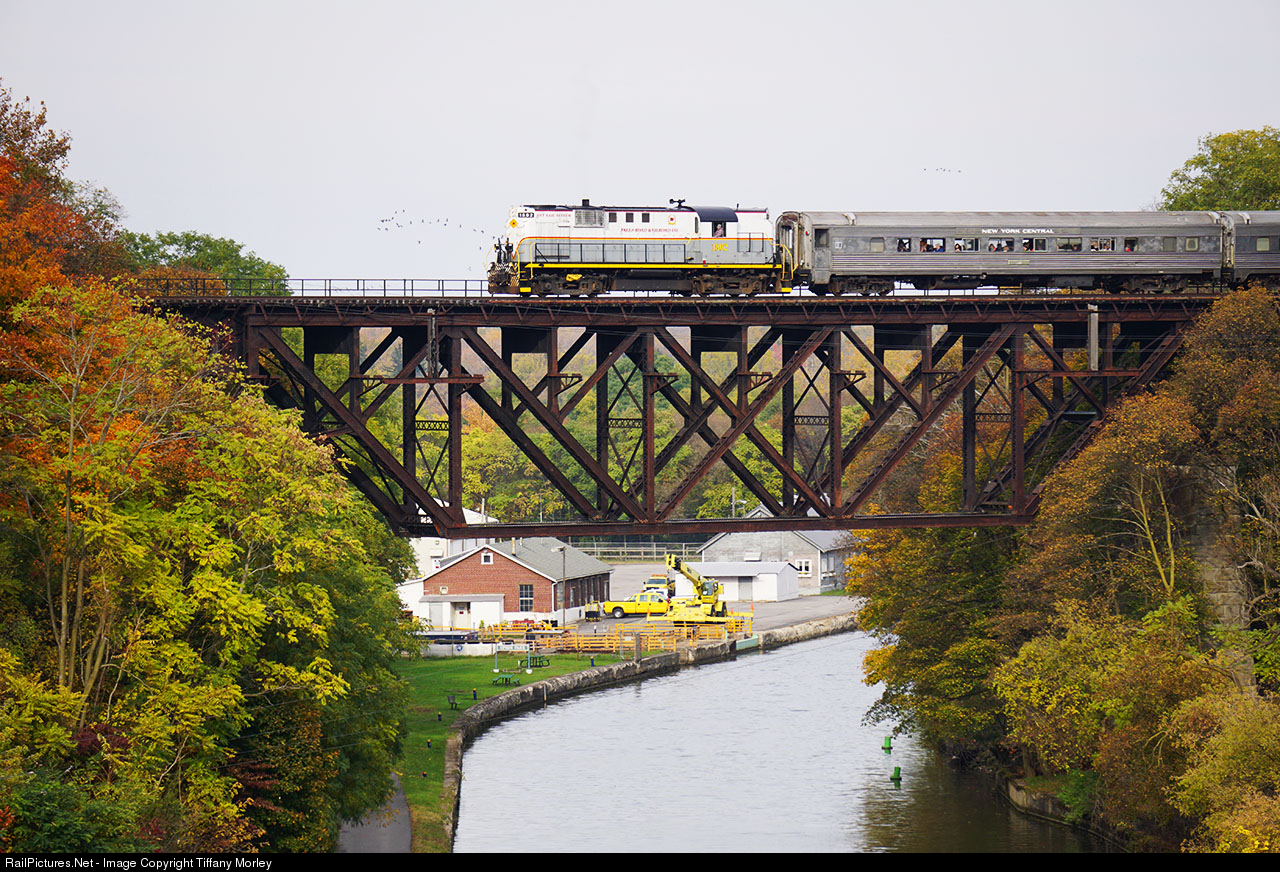 The Medina Railroad Museum's fall foliage train ride crosses the Erie Canal in Lockport NY on a pleasant fall Saturday afternoon.