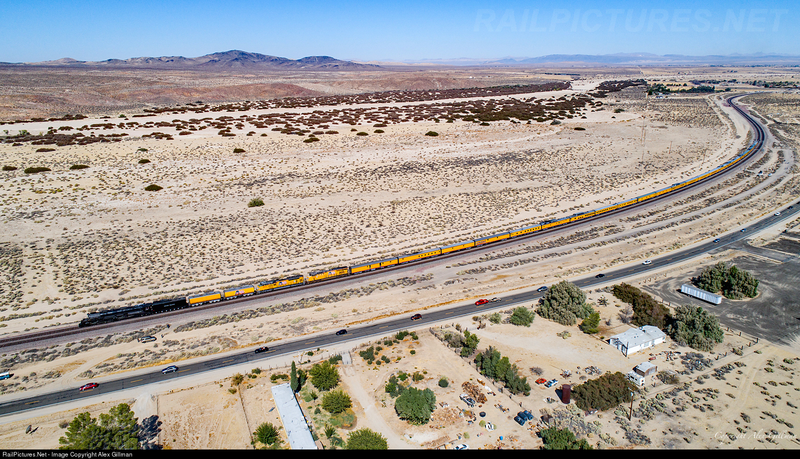 Union Pacific's "Big Boy" steam locomotive, No. 4014, gets the chance to stretch its legs on the winding desert floor as it passes through the community of Hodge. The original AT&SF right-of-way, built in 1885, can be seen to the far right of the image.