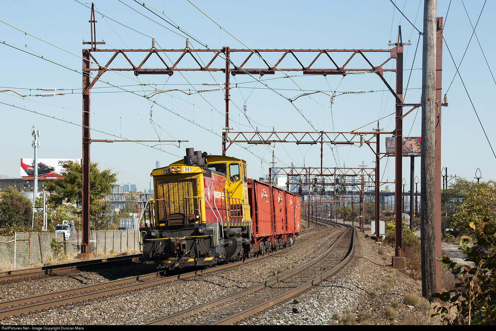 | Morristown and Erie SW1500 #20 hauls four Railroad Construction ballast cars bound for the Dover and Rockaway River Railroad west on NJ Transit's Morris and Essex Line coming up to a stop at HARRISON Interlocking to hold for NJRail 1001. |