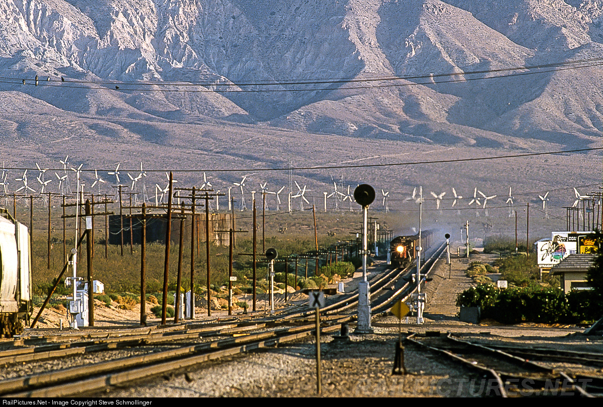 | Shortly after sunrise, a heavy SP open hopper train, with brake shoe smoke rising plentifully from its sides, descends the pass into Mojave. |