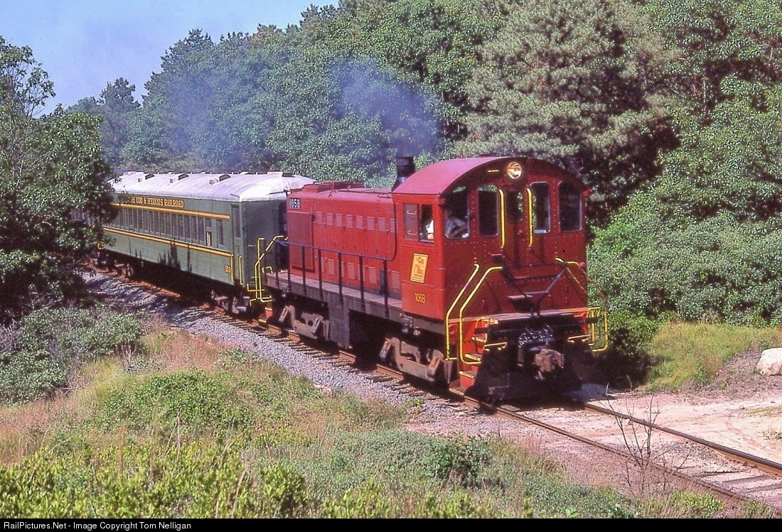 During its first two years of operation, the Cape Cod & Hyannis tourist railroad relied on leased Bay Colony Alco switchers to power its trains. Bay Colony 1058 led this Buzzards Bay-Hyannis train through the woods of Sandwich, MA, on a summer day.