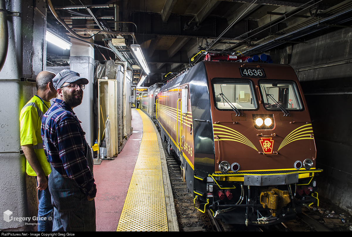 "The Modern Day GG-1" The engineer of New Jersey Transit Long Branch train 3283 takes a glance at the modern day GG-1, NJT Pennsylvania Railroad Heritage ALP-46A #4636, before piloting it on it's first run out of Penn Station. He is coincidentally dressed for the occasion with his "old time" engineer Halloween costume.