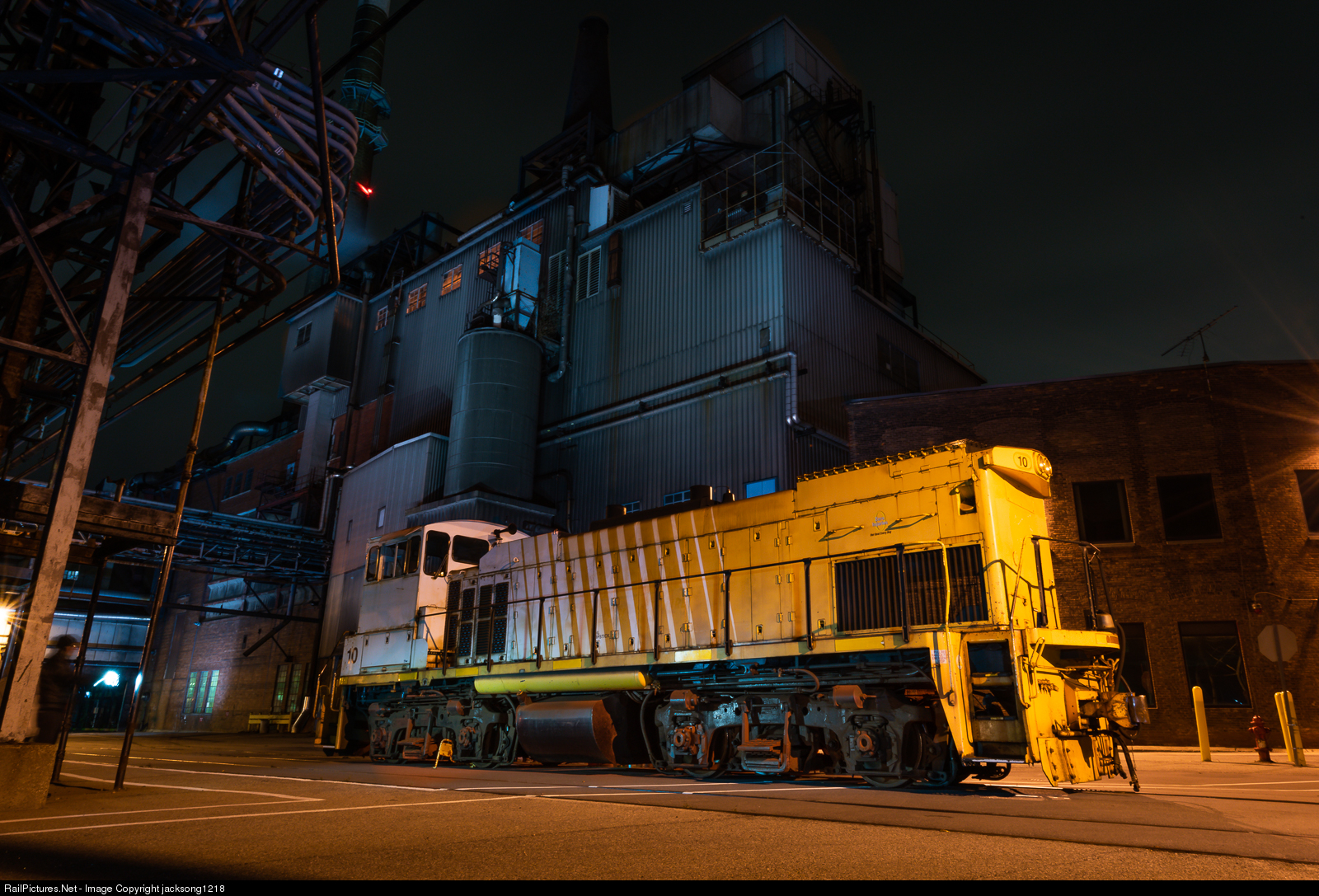 | On a bitterly cold first of November, Kodak Railway MP15AC number 10 sits in the depths of Kodak Park, awaiting its next assignment. This was shot during the Kodak event "Power to Move Us" where Kodak teamed up with the Rochester Institute of Technology's "Big Shot" team to produce a dramatic scene of Kodak's last locomotive. The light on the locomotive was provided by the park's sodium vapor lights, along with flashlights from volunteers. The background building was lit with multiple pops from 4 Profoto B1 strobes. |