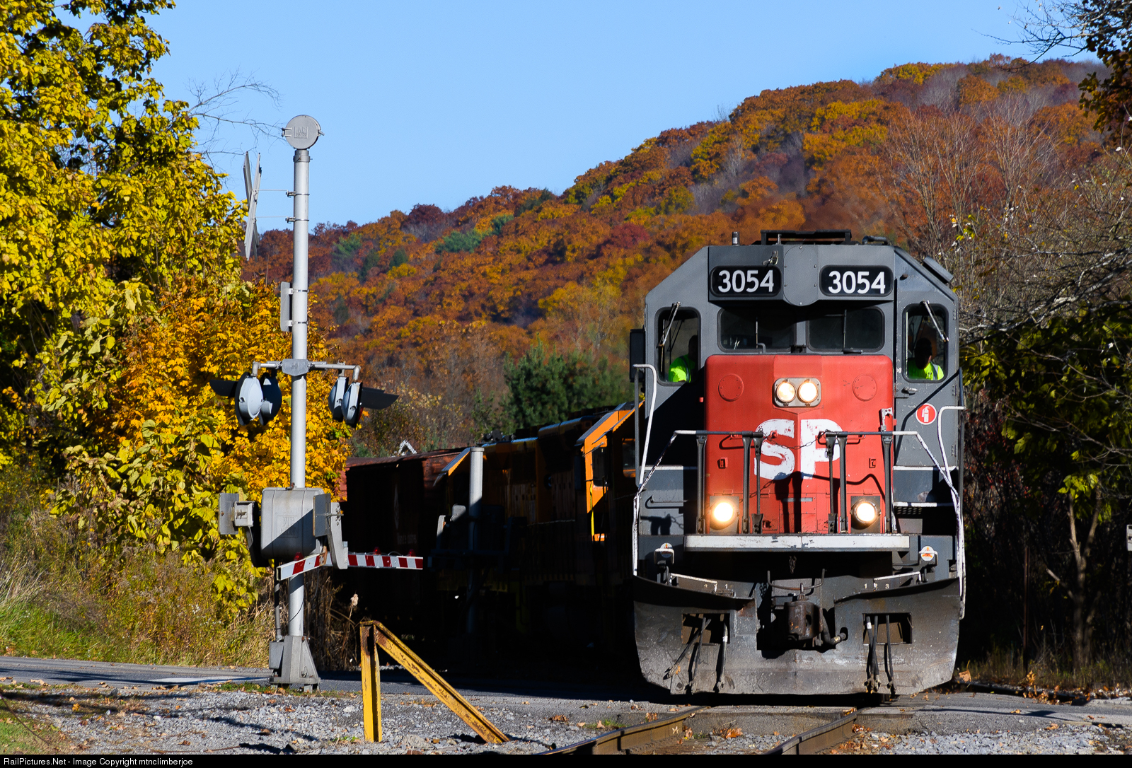 Looking more like a scene out the 1990's in Colorado, GEXR 3054, a former Southern Pacific tunnel motor, leads the Buffalo & Pittsburgh's SIRI freight from Salamanca to Riker. Falls colors are at their peak and the sun shines as the train rounds the bend in Ridgway, Pennsylvania.