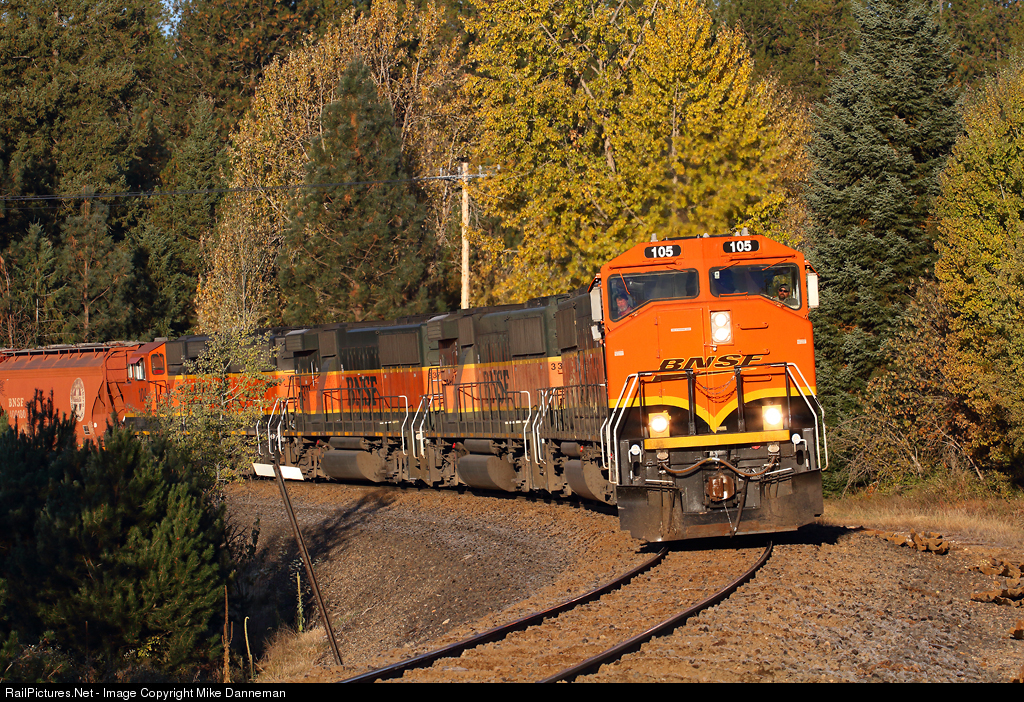 At 8:00 a.m. on October 10, 2019, BNSF’s Chewelah Turn lights up in the rising sun between Loon Lake and Clayton, Washington. Some of the steel ties once used on the line have recently been replaced and can be seen piled along the right-of-way. Five EMD GP60s in perfect A-B-B-B-A formation power the train—GP60M No. 105, GP60B Nos. 336, 331, 337 and GP60M No. 104, all former Santa Fe—heads toward Spokane.