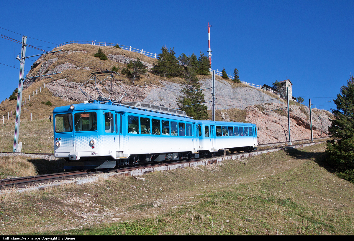 | Cogwheel railcar BDhe 2/4 14, built 1967, on the way from Rigi Kulm to Goldau. |