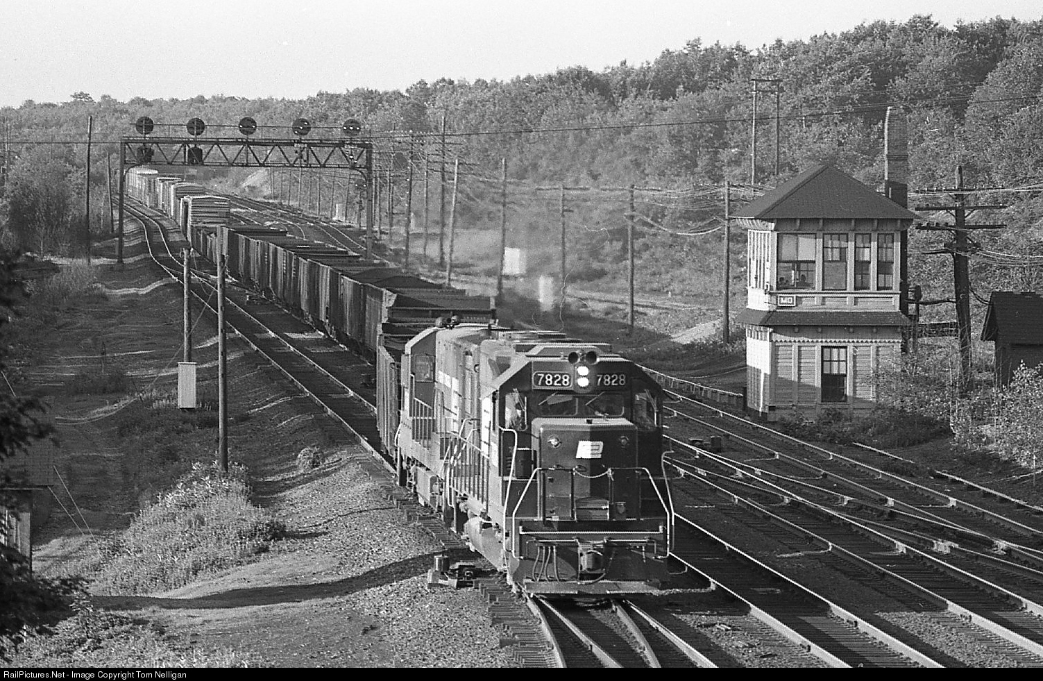 | As the summer sun drops low, a westbound Penn Central freight behind a GP38/U25B duo rolls past MO Tower at Cresson, PA. |