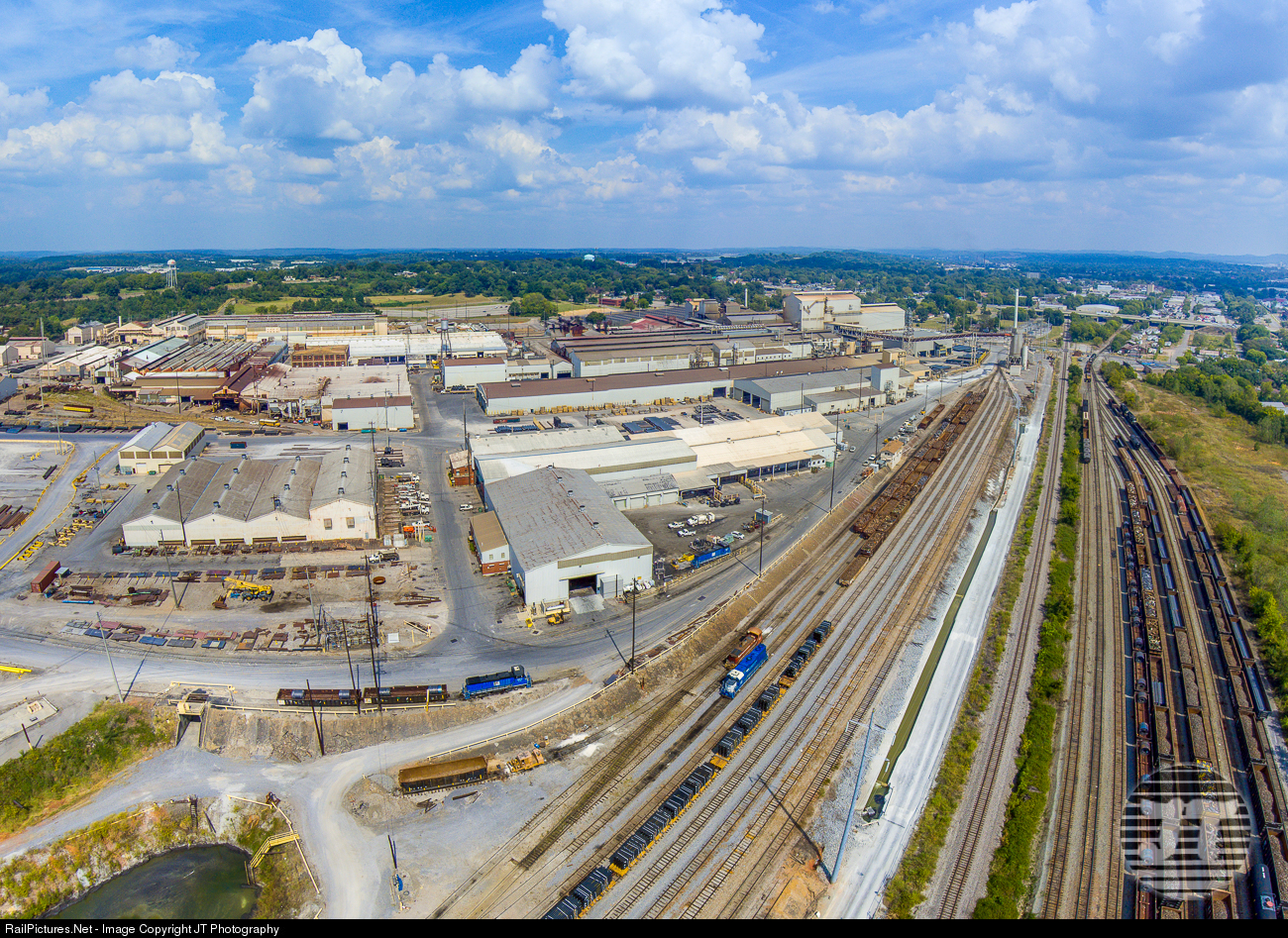 The small fleet of second hand locomotives assigned to work American Cast Iron Pipe Company idle away on a hot late September day. To the right an NS crew can be seen shuffling cars around to take to interchange.