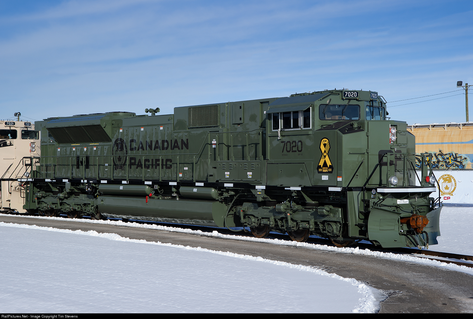 On November 11th, 2019 for Remembrance Day, Canadian Pacific unveiled 5 brand new SD70ACUs at their Ogden Yard wearing various military schemes. Here's a roster shot of CP 7020 wearing the Army Temperate Regions scheme.