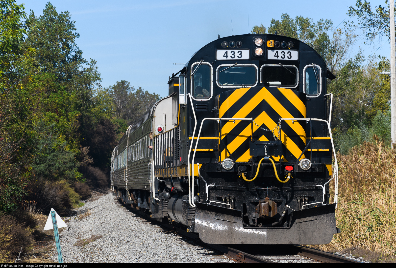 Livonia, Avon & Lakeville Alco C430 number 433 brings up the rear of the Rochester & Genesee Valley Railroad Museum's excursion train as it accelerates northbound out of Avon, New York.