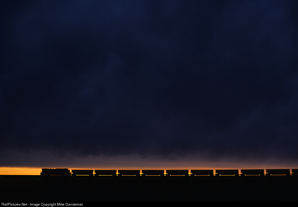 A lone GE AC4400CW pushes a northbound Union Pacific empty coal train at the end of a rainy day in Powder River Basin south of Bill, Wyoming, on May 3, 2007.