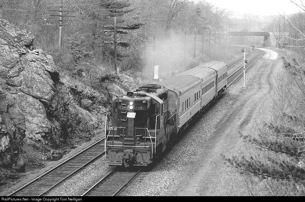 One of Amtrak's first state-supported trains was the Bay State, providing service from Boston to Washington via Springfield and Hartford (the "Inland Route"). Starting up two weeks after Amtrak's debut, in its first incarnation the Bay State ran until 1975. Here a Penn Central GP9 leads the westbound run through Wellesley, MA, on the former Boston & Albany.