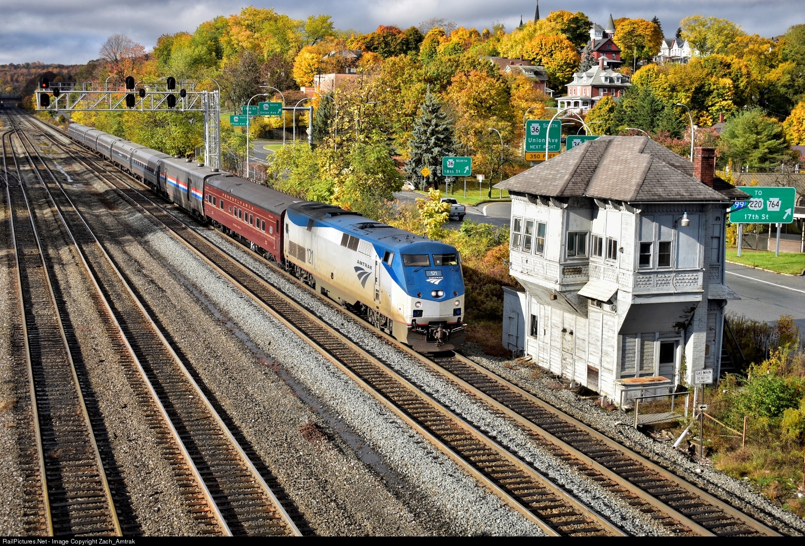 Amtrak Pennsylvania 42, NS 04T, slows on it's approach to the Altoona Transportation Center with the PRR Private Car, Catalpa Falls, between the locomotive and the new Phase III Baggage car
