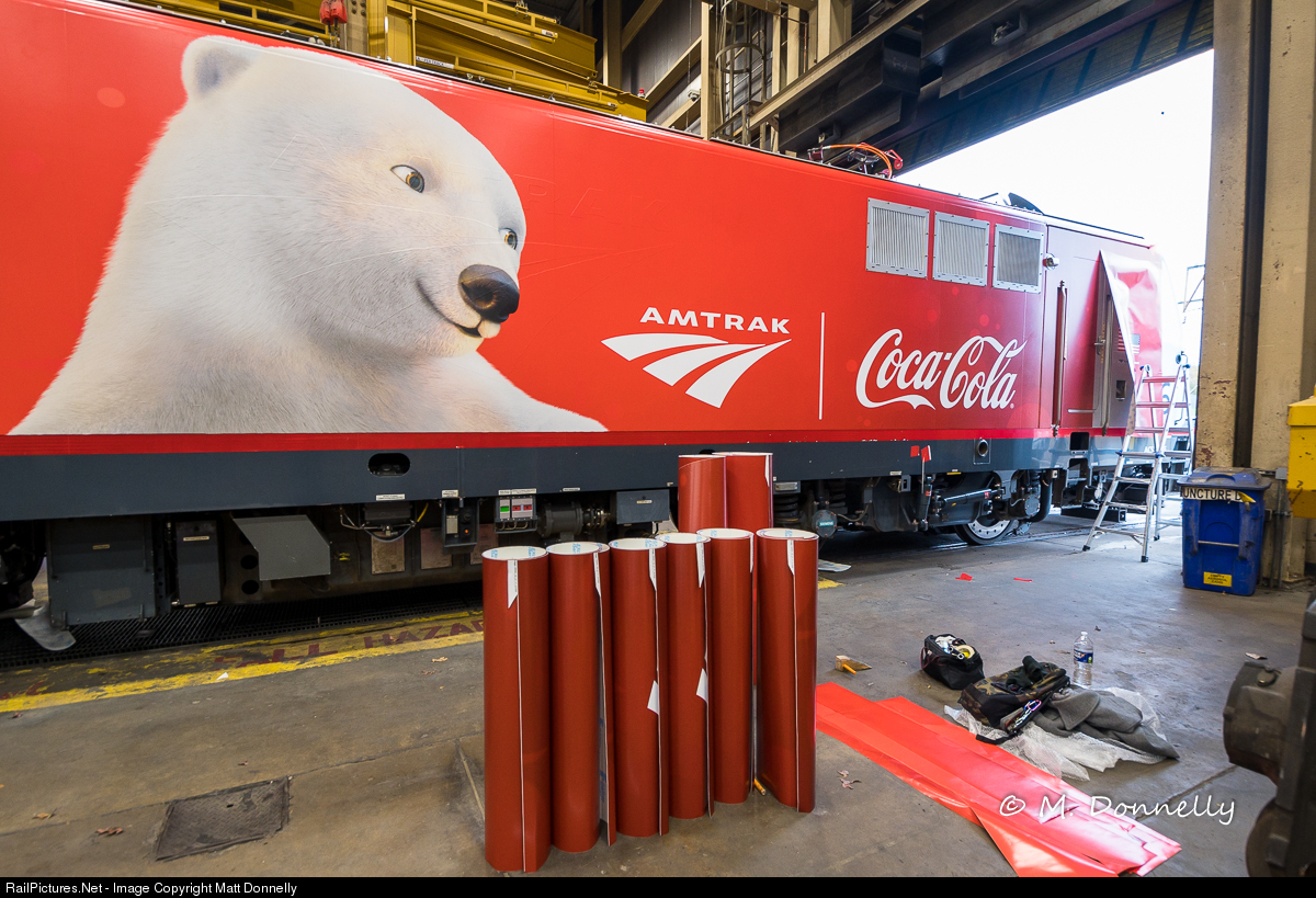 For the holiday season, Amtrak 606 received a Coca-Cola wrap featuring their iconic polar bear and "Share the Magic on Amtrak," marking the relaunch of Coke products aboard all Amtrak trains. The wrap comes as huge rolls of printed stickers that remind me of wrapping paper, but each one is unique. A specific order has to be followed as this wrap has a slight gradient that transitions from a bright red in the center to a darker red toward the cabs.