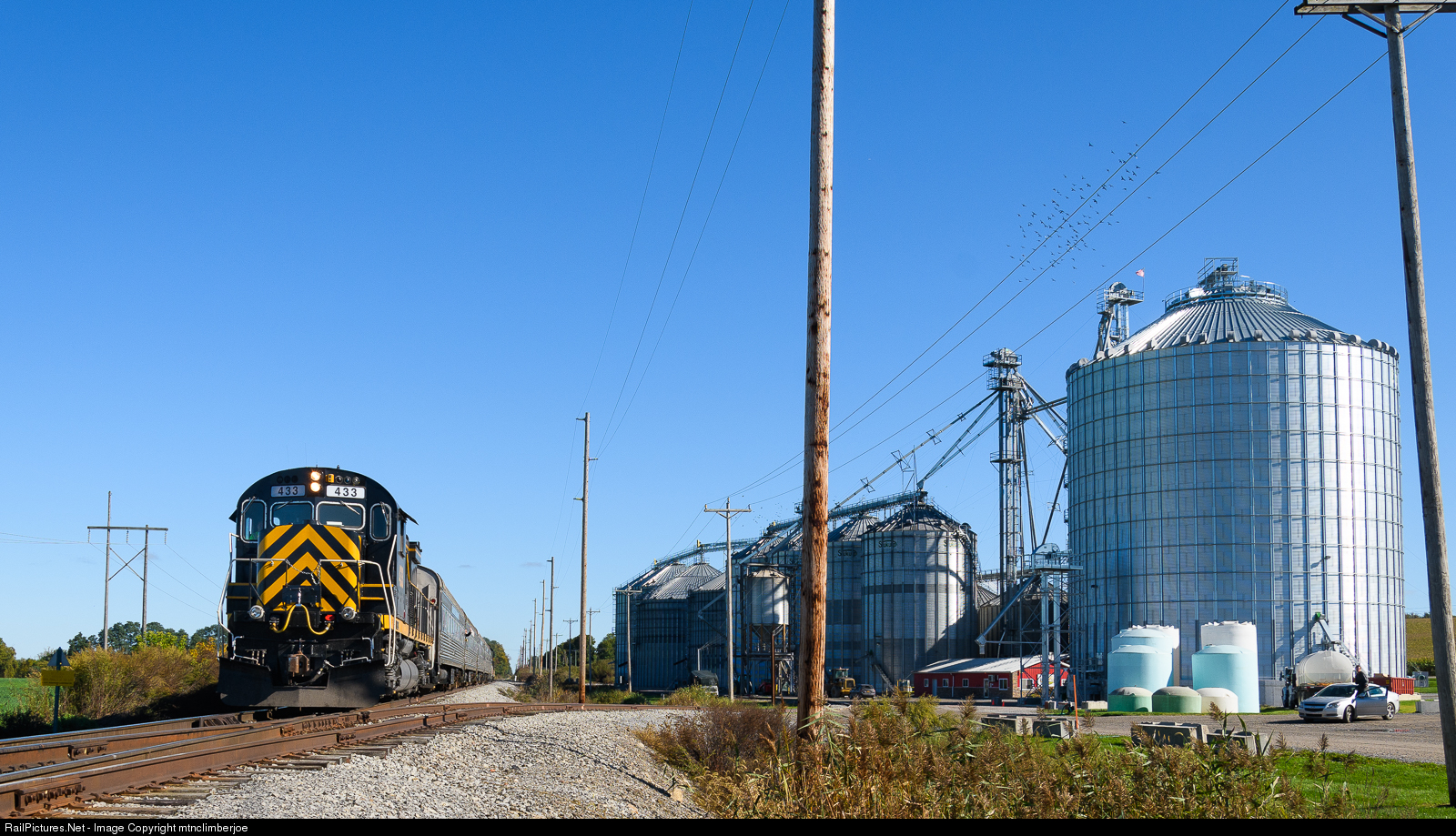 A Rochester & Genesee Valley Railroad Museum excursion train over the LA&L passes by the massive silos at Howlett Farms just outside of Avon. The museum ran three round trip excursions using push-pull Alcos and former NYC coaches.