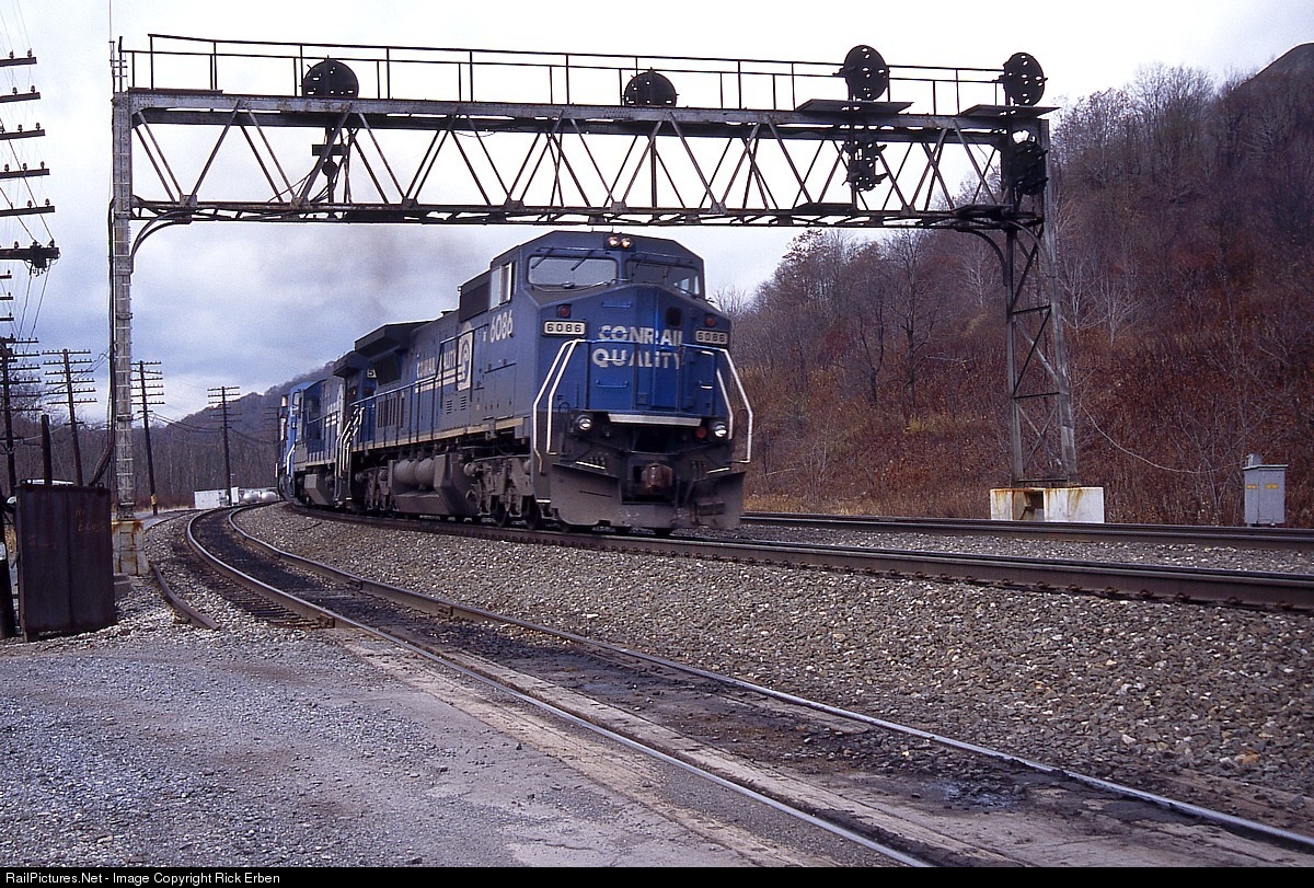Beneath a moody November sky, the 6086 East is storming around the curve coming out of SO Interlocking amidst a number of elements now lost to the railroad atmosphere: the codelines, wayside phone box and magnificent PRR-era signal bridge and position light signals. The track in the foreground with its jointed rail is the west leg of the wye to the South Fork Branch that reached coal mines along the branch of the Conemaugh River. The 1889 Johnstown flood came down the South Fork and its wave was reportedly 35 feet high at this location. Fuji Provia.