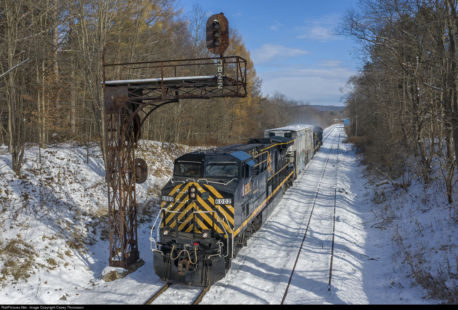 Operating on former Erie Railroad trackage, Western New York and Pennsylvania Railroad AC60 #6002 leads train OL-2 west towards Olean underneath a decommissioned block signal 382 miles from Jersey City.