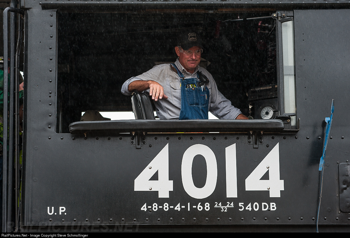 | UP Sr. Mgr of Heritage Operations, Ed Dickens, smiles as he watches scores of visitors pass by 4014 despite the rain. |