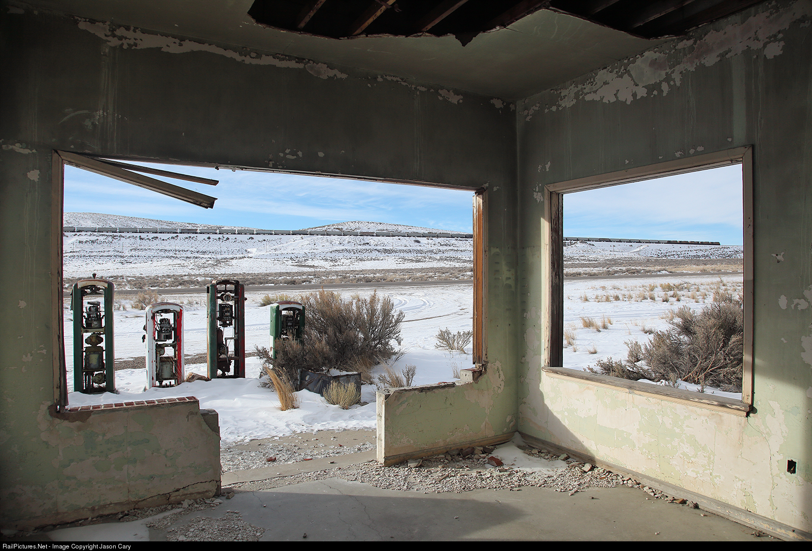 This old filling station along old US30 has undoubtedly witnessed a lot of railroad history pass its picture windows. You can almost imagine a station attendant sitting on a stool glancing trackside as a Big Boy hoists a mile long freight up Peru Hill. No Big Boy and no attendant on this cold January day, just a couple rail-fans trying to capture a antique piece of Americana before its gone forever. Union Pacific helped with sending a Soda Ash Empty up the grade....