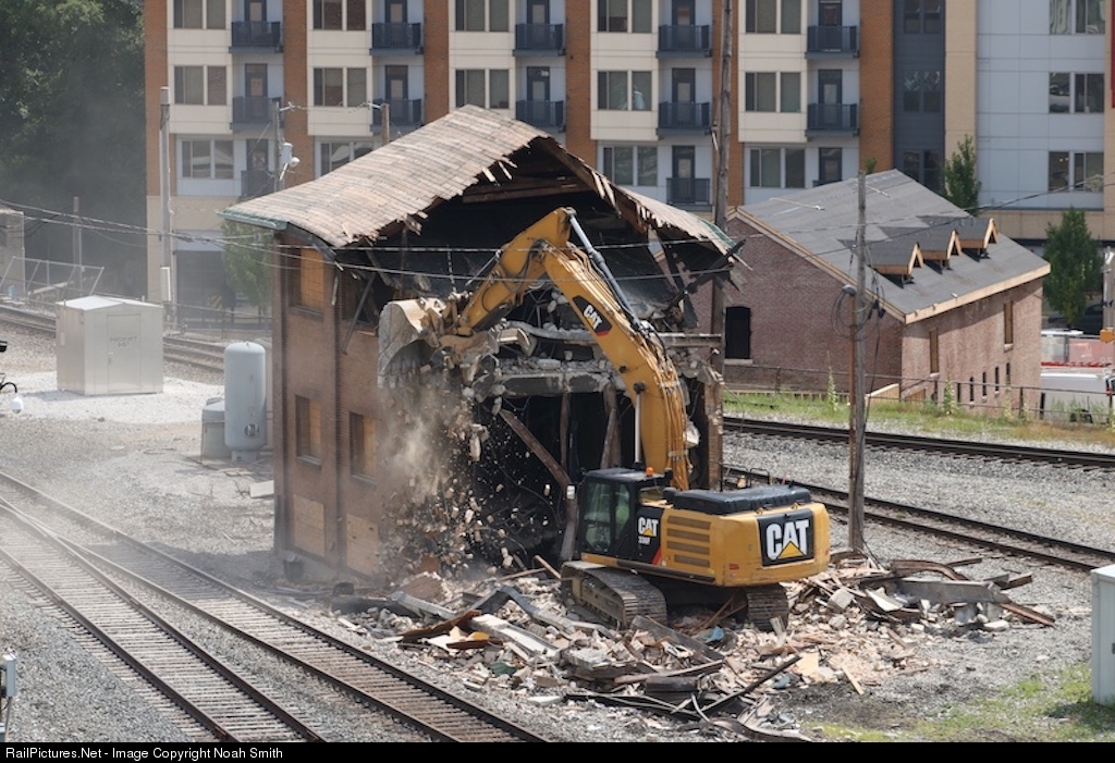 On a humid July morning, CSX crews work on the unfortunate removal of IU Tower in Downtown Indianapolis. Built in the 1930's as part of Indianapolis Union Station modenization project, IU tower had many unique things about it. The tower itself contained a 130-lever US&S Model 14 interlocking machine which controlled a vast amount slow speed double-slip switches and dwarf signals. Additionally unlike Cincinnati's comparable terminal, Indianapolis also served as a junction for through trains for NYC, B&O, PRR, & Monon Railroads.