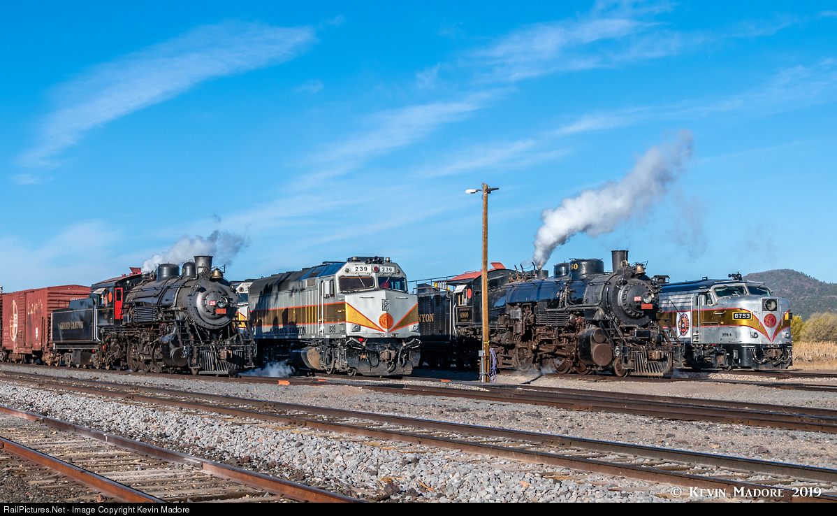 A Power Line-Up. On a windy, chilly morning in late October, a quartet of Grand Canyon Railway trains sit poised in the Williams Yard preparing for a busy schedule of events. These trains display most of the locomotive types from the past and present, including two steam locomotives....perhaps the last time we'll see that for a while. From left to right, we see Consolidation #29 on a photo freight. This former LS&I locomotive is a 1906 Alco product and at the time of this photo, she was appearing in her last event before the expiration of her FRA Form 4. To her right is a pair of EMD F40PH locomotives, led by #239, which will be heading up the line's daily service to the Grand Canyon. As of now, these EMDs are the primary power on the line. To their right is the former CB&Q #4960, a massive Baldwin, 2-8-2 Mikado type dating to 1923. The 4960 sports a tender, which might be more properly called a "tanker", that weighs as much as the locomotive when fully fueled and watered. On this day, the 4960 is pulling a consist of vintage Harriman-style Pullman passenger cars. Last in this line-up is one of the lines venerable Alco FPA-4 Diesel Locomotives built in 1959. Formerly the mainstay of the GCR diesel fleet, these engines are now used only for special events. On this day, #6793 is hauling the line's Pumpkin Patch Special. It's not often when you can photograph all of these engines together, and with the 29 going down for an indeterminate period of time, it might be quite a while before you see it again.