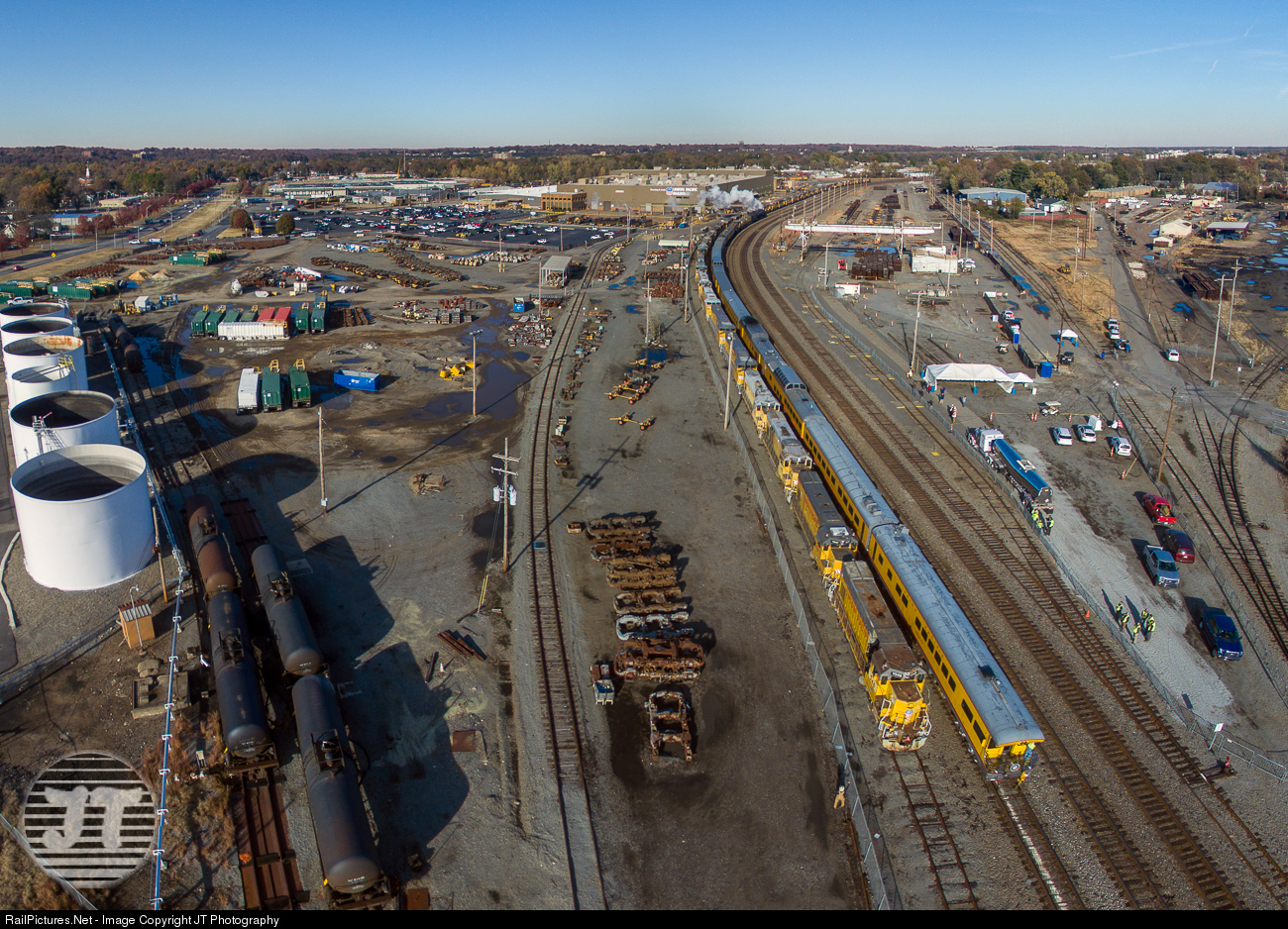 The last car of 4014 rolls past the deadline at UP's Downing B. Jenks Shops while a crowd of UP employees watch from the other side. 4014 will be brought back here after being turned at the Van Buren Wye. UPY 548 is the lead locomotive on the deadline.