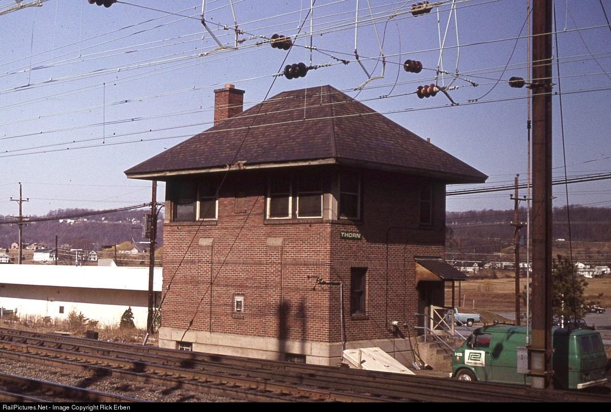 Photographed from the eastbound Broadway Limited, this is Thorn Block Station at MP35 west of Philadelphia on the former Pennsylvania Railroad mainline. Thorn was an example of the importance PRR placed upon its line side control stations and was constructed during the electrification program of the 1930s. The chip in the roof (as well as a few bricks on the front of the tower) was the result of a 1960s derailment when an LCL hotshot's consist started coming sideways at the tower off the P&T Branch (3rd track from the tower). Fortunately the building was constructed well. The US&S CTC machine controlling this territory is shown here: https://www.railpictures.net/photo/630340/