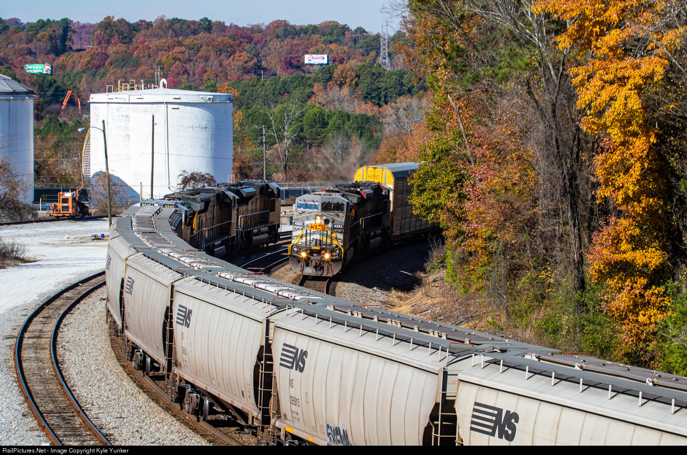 A grey KCSM AC4400CW leads NS 24E into Atlanta meeting empty grain train 51A at Bridge
