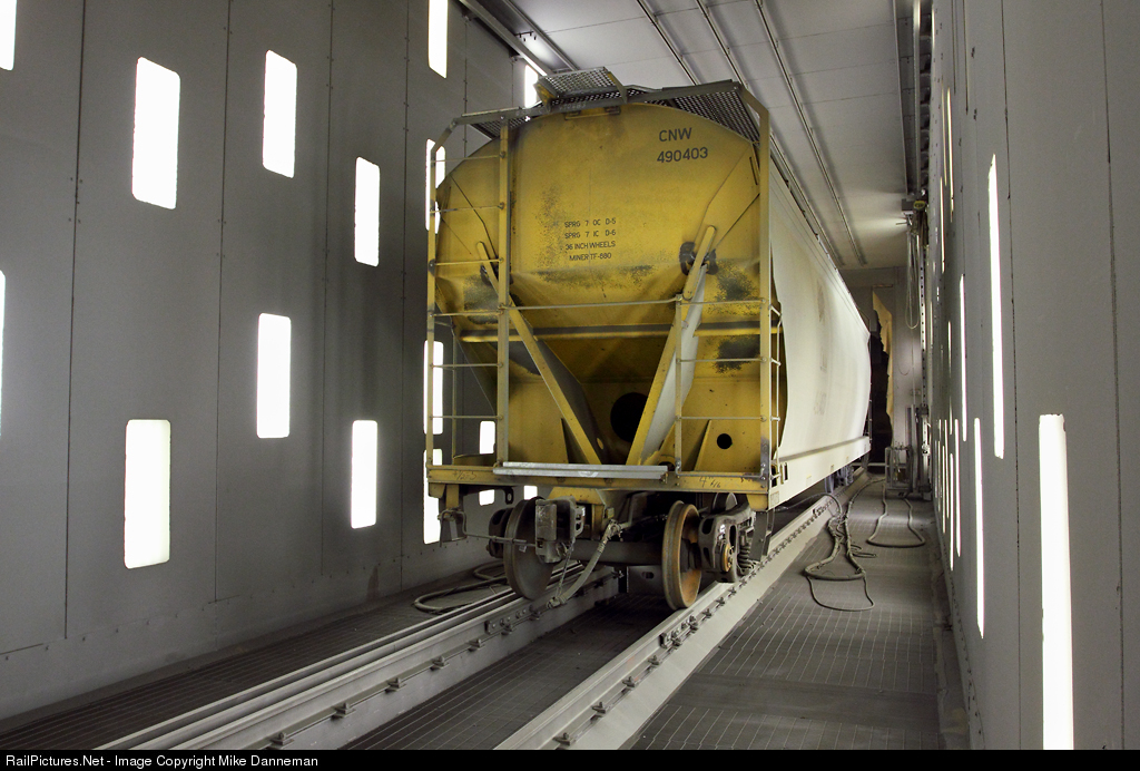 Chicago & North Western covered hopper No. 490403 has just been rebuilt at Union Pacific’s car shop in De Soto, Missouri, and awaits stripping of its old paint in the sandblasting bay of the paint shop prior to a new paint job on September 28, 2011.