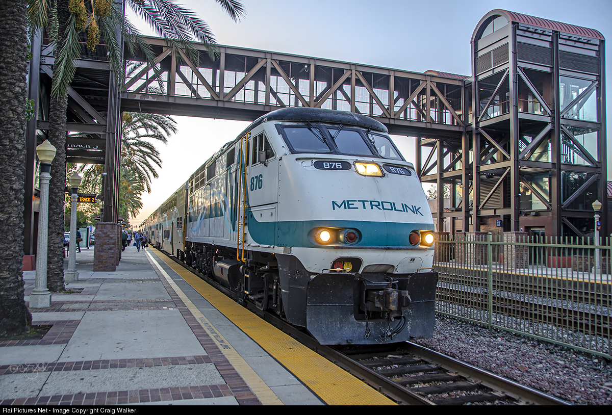 | Running 24 minutes late (due to a bad accident on this line ten hours earlier) as it arrives at the Fullerton station, Metrolink train 704 is heading from Los Angeles to Irvine. Twenty-five-year-old F59PHI 876 is the assigned power for this train this evening. (Fullerton, California – November 22, 2019) |