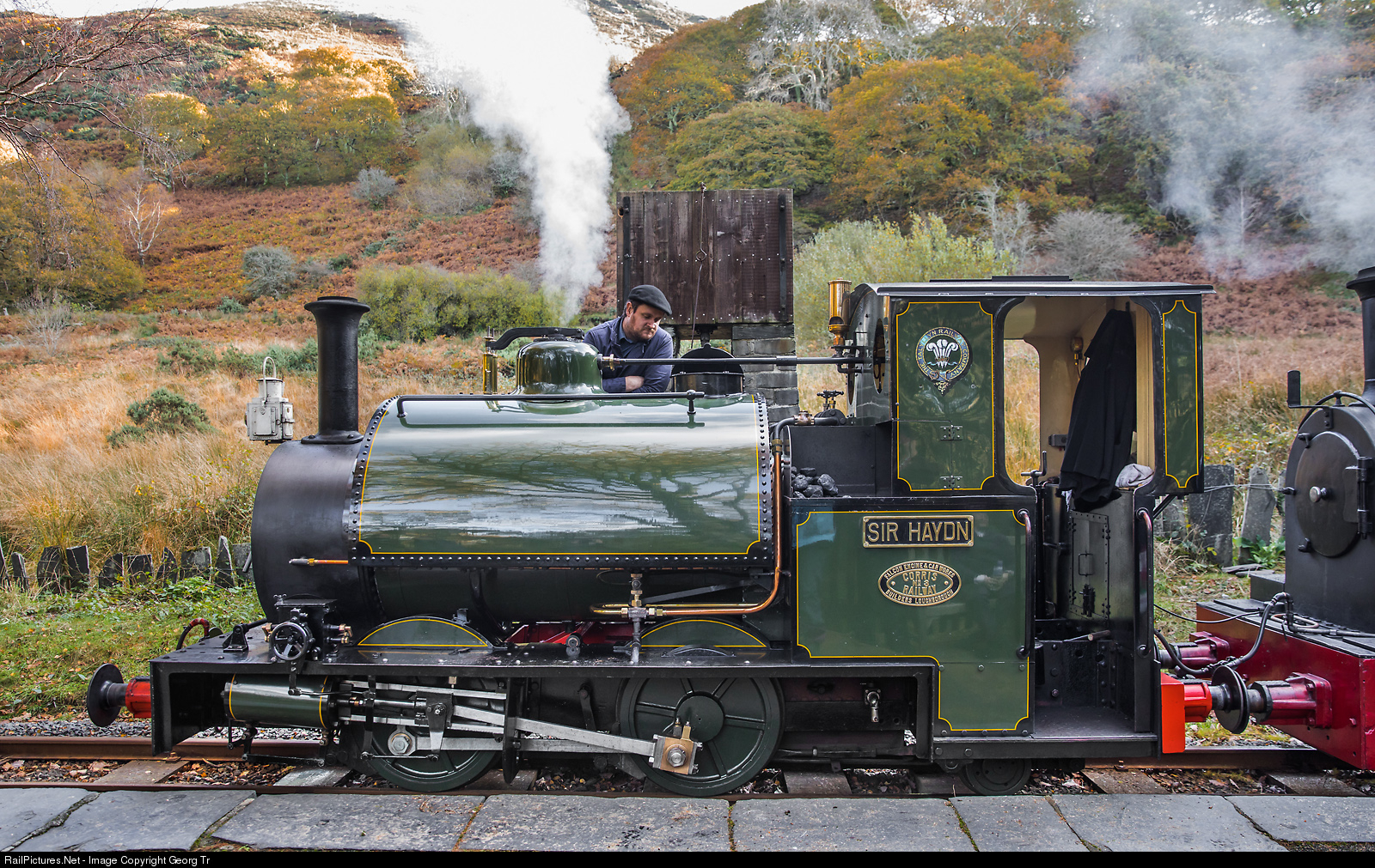 | 0-4-2 saddle tank steamlocomotives # 3 "SIR HAYDN" taking water in Dolgoch. Locomotive # 3 was built in 1878 by Hughes’ Loco & Tramway Eng. Works Ltd of Loughborough for the Corris Railway as 0-4-0 ST and in 1900 it was fitted with a trailing pony truck, converting it into an 0-4-2 ST. It came to the Talyllyn in 1951. Overhauled in the workshop of the Vale of Rheidol Railway in Aberystwyth, and running like new since 2018. |
