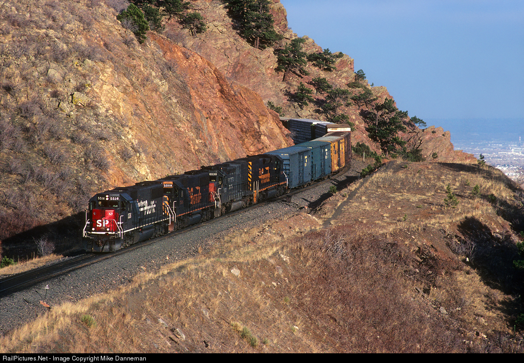 On the afternoon of March 19, 1997, an eastbound freight drops downgrade out of Plainview, Colorado, on Union Pacific’s newly acquired Moffat Tunnel Subdivision. The train is powered by a pair of EMD SD50s and a pair of EMD SD40T-2s, with one each in Southern Pacific and Rio Grande liveries. Lead locomotive SP No. 5516 is a repainted Rio Grande SD50.
