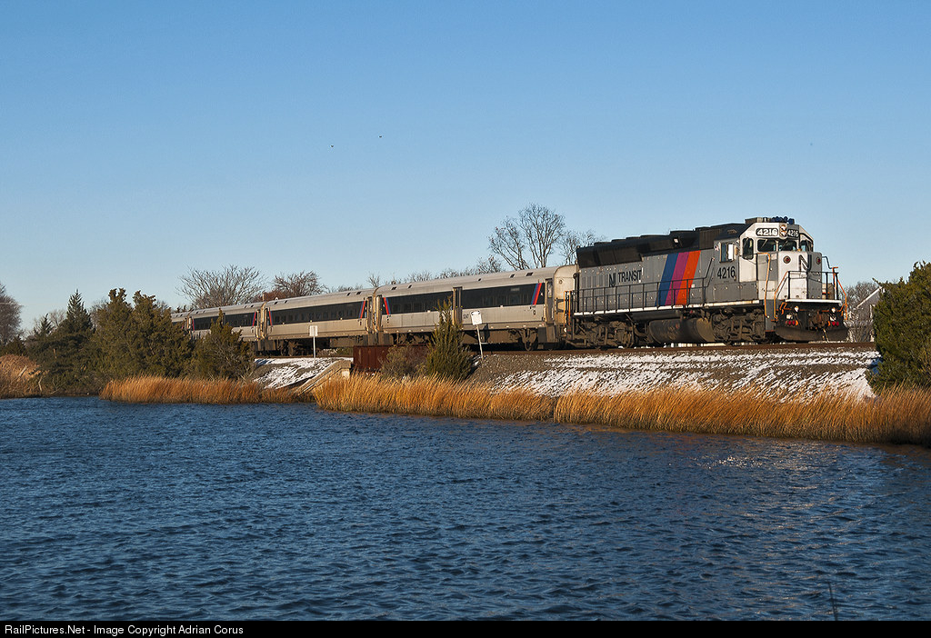 | There was a time when EMDs were a regular on this part of the North Jersey Coast Line. Then with the arrival of the PL42AC and ALP-45DP locomotives the regularity of EMDs slowly faded away and has become a rare occurrence to see one down here. Pictured here is NJT GP40PH-2B 4216 spending some time on the Coast Line with westbound shuttle 4343 to Bay Head passing Watson Creek in Brielle on an extremely cold and windy early December evening. The snow on the ballast is leftover from a previous overnight snowstorm. Both the locomotive and Comet commuter cars wear the classic NJ Transit “Disco-Stripe” paint scheme. |