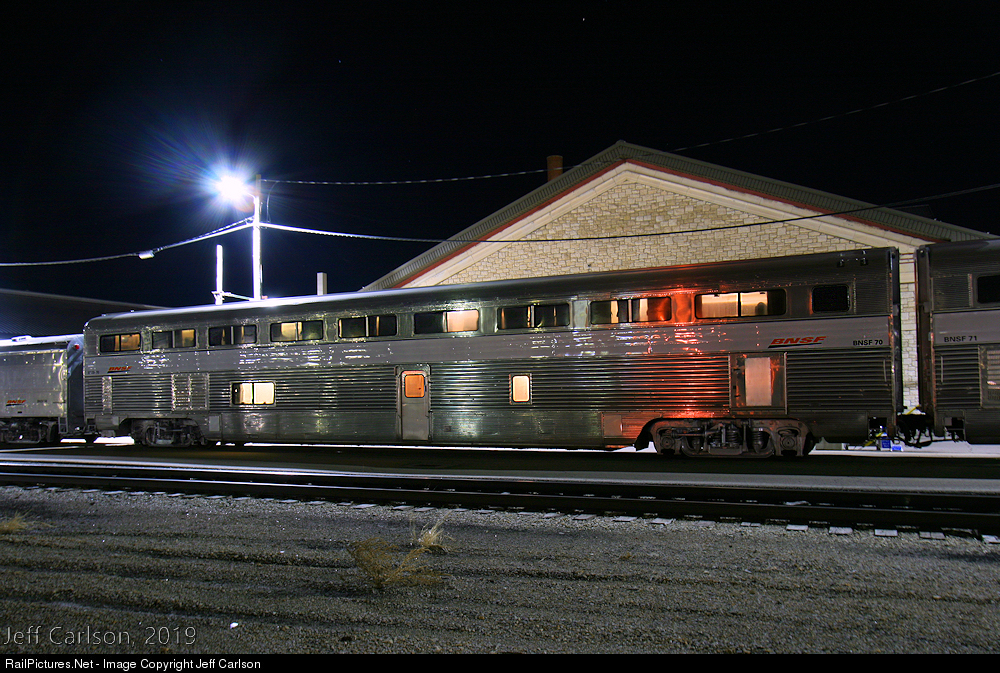 | This afternoon, BNSF's two new "Snow Coaches" left Topeka for the first time on a shakedown run behind the BNSF 4477. These are now the BNSF 70 and 71, and each one of the ex-Santa Fe Hi-Level coaches is now paired up with an ex-ATSF baggage car-turned-HEP car. These cars are to roam the system to transport crews to/from trains where the normal crew vans can't access due to snow. |
