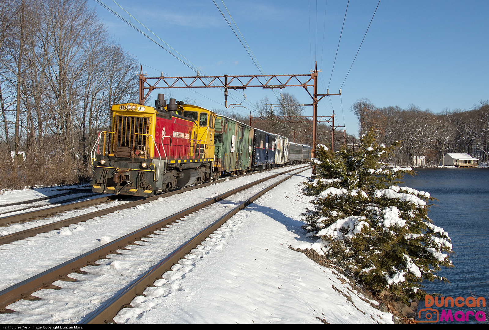 | After making a run over NJ Transit's Montclair-Boonton Line, M&E MX-20 skirts along the shores of Lake Estling on the former DL&W electrified mainline with the Operation Toy Train cars in tow for Dover Yard. |