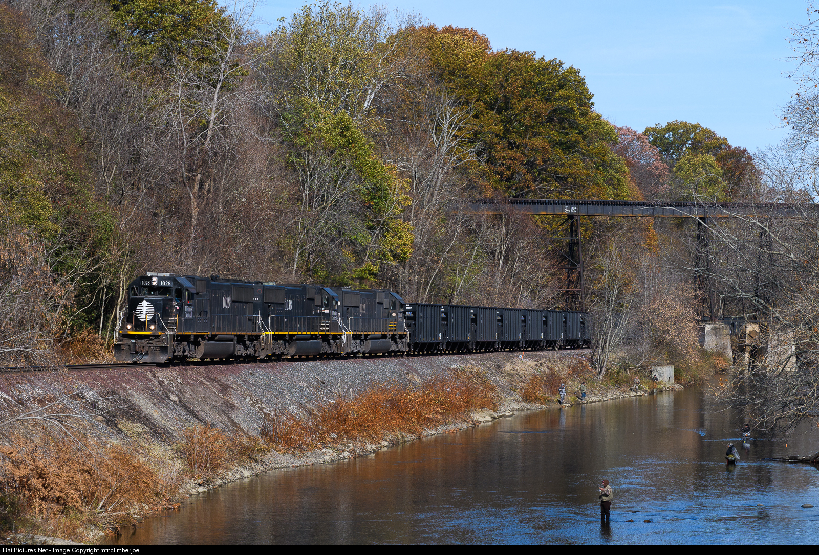 | Fly fishermen line the river as a trio of Illinois Central SD70's lift loaded ore train U702 out of the harbor in Conneaut, Ohio along the bank of Conneaut Creek. The NS Lake Erie District trestle crosses the line in the background. |