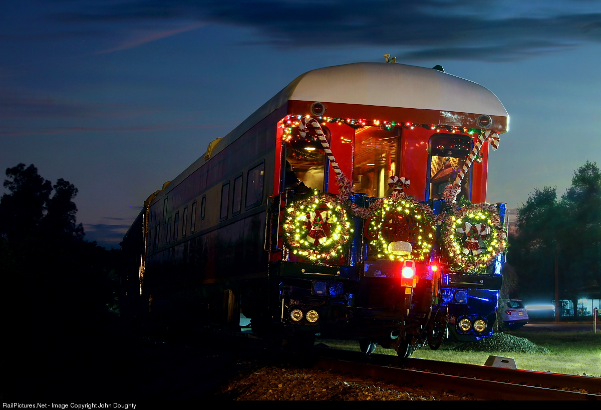 | The blue hour has almost gone as the Elves aboard Santa's FEC St. Augustine passenger car work hard filling up balloons and getting more toys ready to pass out to waiting children in Cocoa, Florida. This is the annual Florida East Coast Toys for Tots - Santa Claus special, and this year the trip has been broken up into two days. The crowds are very large as children wait in a long line to meet Santa. |