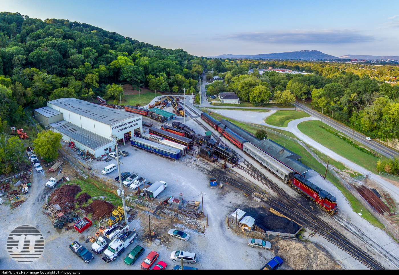 TVRM 1829, formerly USAX 1829, sits on the western end of the TVRM by their 1950's decorated station. 1829 was built in 8/1951. Later it will head over to the Grand Junction Station for the first train of the day. To 1829's left is Southern Railway 4501 currently disguised as L&N 1593 for a photoshoot it will haul the next day. It was built by Baldwin Locomotive Works in 10/1911 as a 2-8-2. Behind it is Southern Railway 630 built by Alco in 2/1904 at their Richmond Shops.