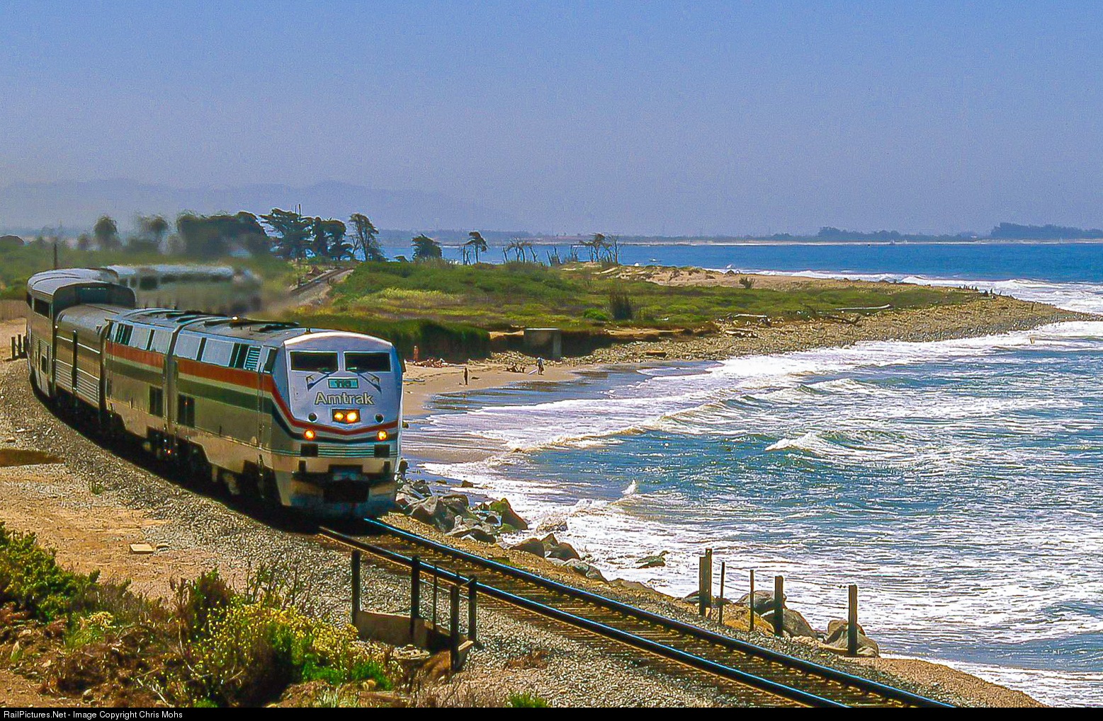Amtrak No. 14 the northbound Coast Starlight, highballs Ventura and rolls through Emma Wood State Park.