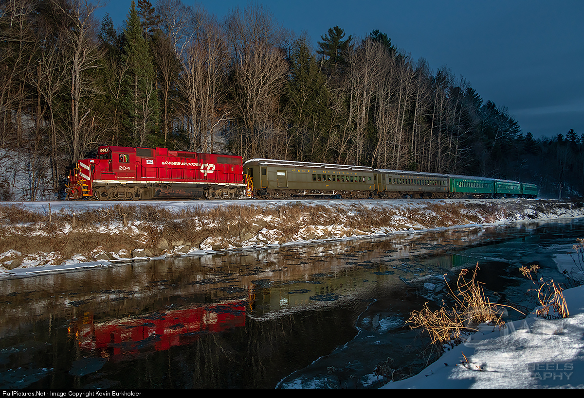 Vermont Rail System operated The North Pole Express, weekend trips chartered by The Lyndon Freighthouse on December 7 and 8. Using the Green Fleet cars, VRS assigned CLP GP38-2 204 to the trains that operated from downtown Lyndonville at the Freighthouse, to roughly Mile 28, not quite 10 miles north of town and return. The train is seen here at Lyndon, skirting the Passumpsic River on Sunday, December 8.