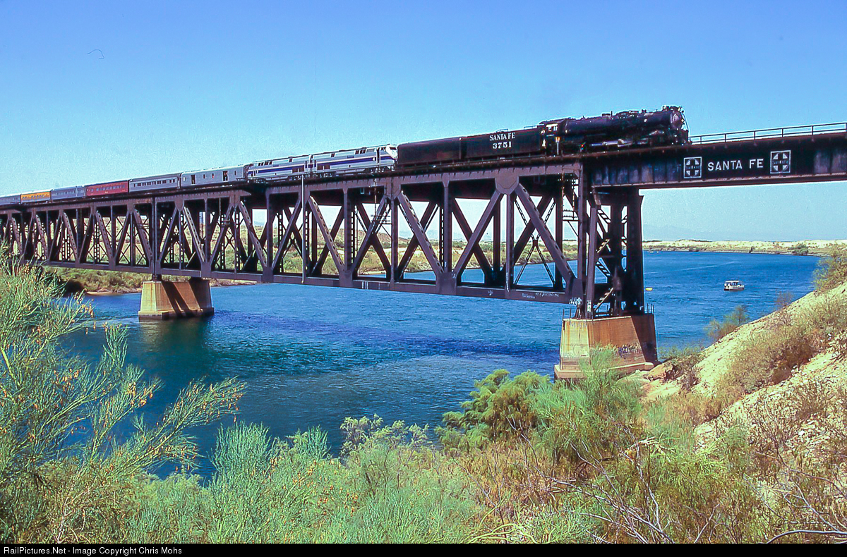 ATSF 4-8-4 No.3751 with the Grand Canyon Special crosses the Colorado River at Topock Arizona. In conjunction with the NRHS the 3751 will visit the Grand Canyon on it's swing through the Southwest.