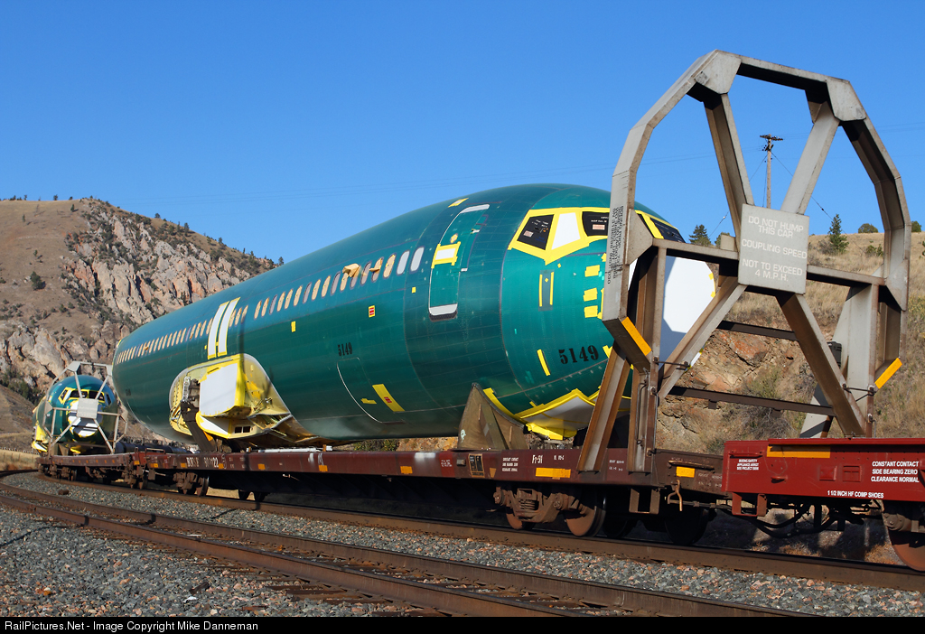 A Boeing 737 fuselage heads west on a BNSF priority freight at Bearmouth, Montana, on September 26, 2014. This fuselage is built by Spirit AeroSystems, and is being shipped from Wichita, Kansas to Boeing in Renton, Washington, for final assembly. The big load is riding specially-modified BNSF 89-foot flatcar No. 800122 and besides being an oversize load width-wise, the length of the fuselage is over 100 feet, so idler flatcars are also used for each one, under the tail section. The front of the flatcar is equipped with special framing to protect the oversize load during shipment. The “green” color of these fuselages is a thin protective coating applied at the factory to prevent the aluminum skin from oxidizing during shipment, and is removed before the airplane is painted.