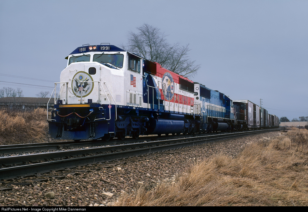 Soo Line train 425 departs Pewaukee, Wisconsin, after meeting Amtrak 8 at the end of double track on January 15, 1995. A rare locomotive consist powers the train today, with Burlington Northern EMD SD60M No. 1991 leading an Oakway SD60 and a former Milwaukee Road “banditized” MP15. No. 1991 is specially-painted to honor U.S. troops serving in Operation Desert Storm in the Gulf War. A large seal of the United States graced the mostly white front of the locomotive. On the sides were large 11’ x 6’ oval logos that included words reading “Pulling For Freedom” and “Supporting Our Troops.” Yucky weather, but that can be expected in Wisconsin this time of year and No. 1991 adds some color to the gray day.